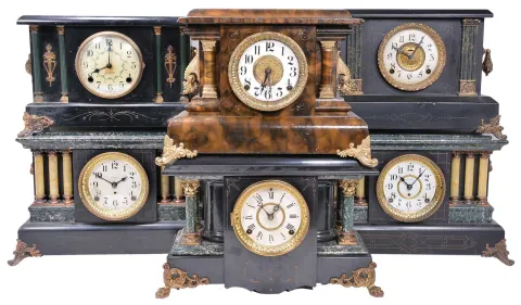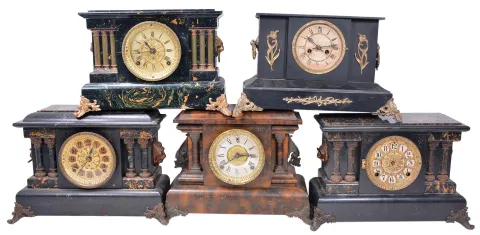 Clocks- 11 (Eleven) black mantel including E. Ingraham, Sessions, several Seth Thomas adamantine including the "Shasta" model, Welch "Nicolini" and an iron cased Waterbury.