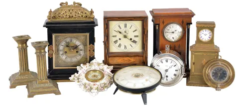 Clocks- 8 (Eight) Mantel & Desk: (1) Austria, bracket clock, 8 day, time and strike in a wood case with brass basket top and silvered chapter ring; (2) Winterhalder & Hofmeier, Germany, mantel clock, 30 hour, time and strike in a walnut case; (3) "Rapid Ralph" novelty clock; (4) Benzie Cowes, England, wall clock in nickel case; (5) Hanging clock, 30 hour, time only in ornate ceramic case; (6) Germany, car clock with a brass mounting plate; (7) Hamburg American Clock Co., Germany, 8 day, time only in wood case; (8) Watch-sized movement in miniature chest of drawers; (9) and (10) brass candlesticks. Sold "as is".