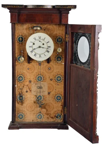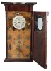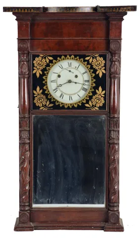 Mahogany and mahogany veneer case under a dark heavy finish that appears original. There is some nice stencil decoration on the front edge of the top. There is some minor damage on the right side bottom molding. Original mirror. Dial tablet is a proper style replacement. Original painted dial has some loss at the mounting pillars and a bit of wear to the chapter ring. Original hands and eagle pendulum. Seconds hand is probably a replacement. The weight pulleys are replacements. A nice clean label inside and original period wallpaper dust liner.