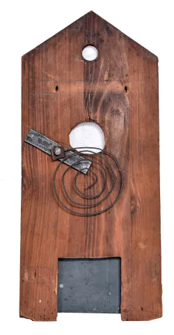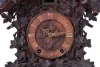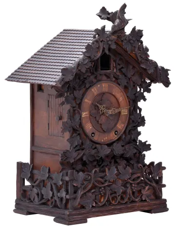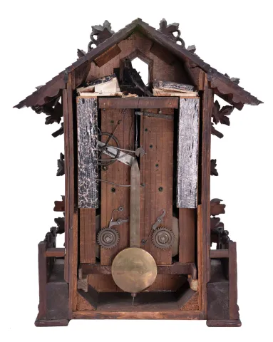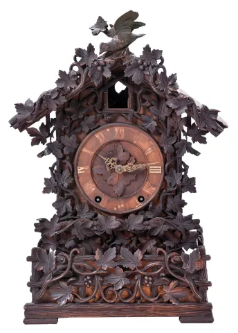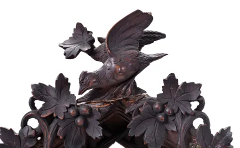 A very nicely carved case has a couple carved leaves with tip damage and glue repairs. The section on the bottom front carved fence that is broken off is inside the clock. Carved bird to the crest is also inside the case. The bellows will need to be restored. Some of the numbers are missing. The French-style brass hands are incorrect. Door to cuckoo opening is missing.