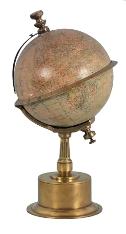 G. Thomas, Editeur, 11 Rue de Sommerard, Paris, an Edwardian globe clock, the cylindrical, quarter round molded brass base supporting a tapered, fluted column, attached to the stationary globe mount, engraved, Roman numeral equatorial ring with adjustable pointer, and 8 day timepiece movement concealed in the base, driving the globe through the a linkage in the column, c1890. There are a number of minor repairs to the globe surface including a dime-sized patch in the Middle East. There is a small loss to the surface located in the Atlantic adjacent to an old repair and some excess glue. Long, shallow cracks along part of the equator and both poles. The clock is missing a small dimensional representation of the sun, which should be mounted on a curved wire extending from the base. The movement ticks briskly.