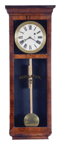 Rosewood veneered case in an old and possibly original finish has some veneer loss on the bottom right corner of the bracket, on the bottom left corner of the door and some lifting and cracking of the veneer on the cornice top. Original painted dial has small loss near 3 o'clock and at the winding arbor. Original hands and pendulum. The wood rod looks to have been gold painted over the gilding. Original door glass. Dark, but readable label inside the bottom of the case. The weight is a possible replacement or someone has added a cap.