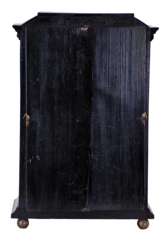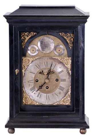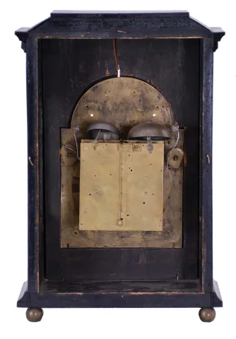 Clocks- 2 (Two): The first an ebonized, three train Austrian bracket clock with mock pendulum, Joseph Kamlosy, ebonized rectilinear case on brass ball feet, composite dial with Roman numeral, arcaded chapter ring, brass movement with verge escapement,