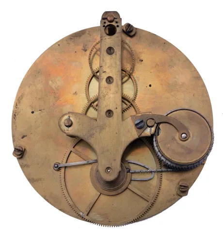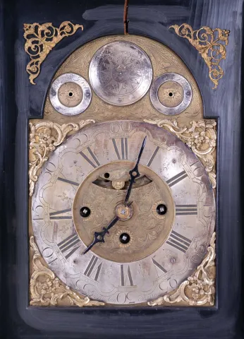 Clocks- 2 (Two): The first an ebonized, three train Austrian bracket clock with mock pendulum, Joseph Kamlosy, ebonized rectilinear case on brass ball feet, composite dial with Roman numeral, arcaded chapter ring, brass movement with verge escapement, striking the full quarters on two bells, c1785, the other possibly Swiss, rosewood case with painted decoration and brass trim, Roman numeral white enamel dial, unusual brass fusee timepiece movement with pinwheel escapement employing a steel cylinder from which the pallets are formed, c1800, bracket clock dimensions given not running, bracket clock missing chime control, hands missing to subsidiary dials, 2 time hands replaced, the other clock in need of escapement and case work, both require restoration