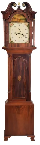 Scotland, unsigned tall clock, 8 day, time and bell strike, weight driven brass movement with painted metal dial in a mahogany inlaid oak case with broken arch top set with brass rosettes and finial, full columns flanking hood door and reeded quarter columns flanking trunk door, the door inlaid with bird, and on ogee bracket feet the clock is in good restored condition. Two finials are absent. The numerals on the dial have been restored. There is small chip on the rear trim on hood. The feet have been replaced and the hood door glass has been replaced with plexiglass The pendulum and the weights are period.