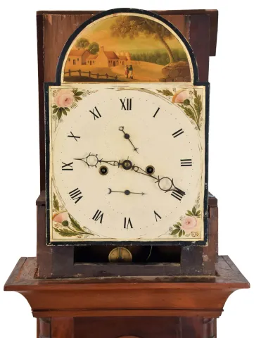 the clock is in good restored condition. Two finials are absent. The numerals on the dial have been restored. There is small chip on the rear trim on hood. The feet have been replaced and the hood door glass has been replaced with plexiglass The pendulum and the weights are period.