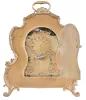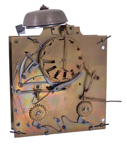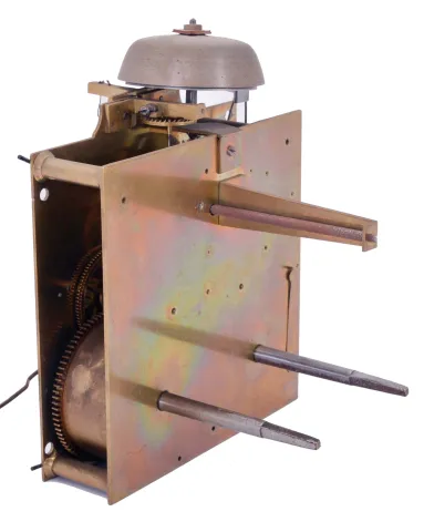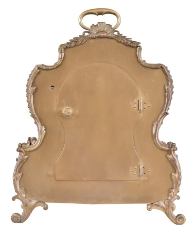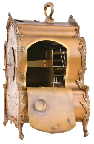 very dirty, losses to gilding, carrying handle with break at pivot, removable lamps which fit the two sockets inside the case missing, feet with minor bends, one movement mounting foot loose from case back, movement very dirty, complete, ticks and strikes, time third wheel arbor repivoted at back plate, loose, steel parts with minor oxidation. This is a rare clock, of high quality, in very good condition overall. A two sided night and day clock with similar piercing and attributed to Jacquet - Droz is illustrated in Derek Roberts "Mystery, Novelty, and Fantasy Clocks", pages 79 and 198.