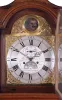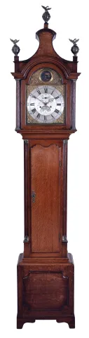 Merryweather, Birmingham, late 18th century tall clock with automata in the arch, the oak case with bracket feet, the base with thumb molded panel with incurved corners, trunk with engaged quarter columns and thumb molded door with oxbow and ogee shaped