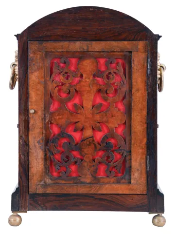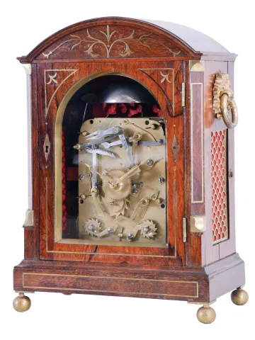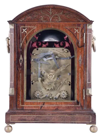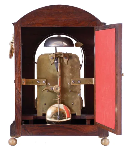 Frodsham, Gracechurch St., London, bracket clock, rosewood veneered, arch top case with brass inlay and furniture, rear door with decorative, scroll cut fret, sheet iron dial plate, well finished 8 day, two train movement, striking the hours in passing,