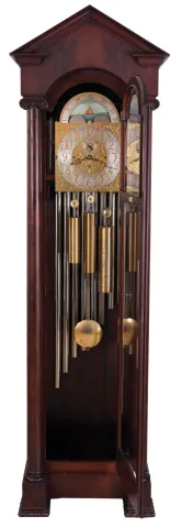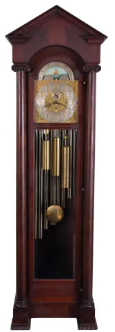 English, 3-train, 9-tube, brass dial tall clock, retailed by Bigelow, Kennard & Co., mahogany case with pediment top, door with two bevelled glasses, and with flanking columns having carved Ionic capitals, and resting on carved feet, composite dial with aplied numerals, silvered chapter ring and seconds bit, and displaying the phases of the moon, 8 day, quarter chiming, weight driven movemen the clock is in very good original condition and the case retains its original finish. The dial is in excellent condition and one tube has a small crack about 2". The clock was running in the consignor's home and was well maintained.