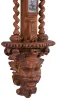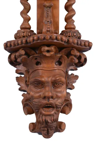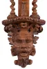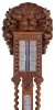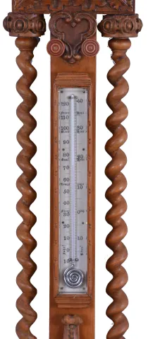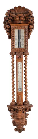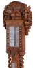 T. Boxell, Brighton, an ornately carved softwood barometer, the base with "green man" mask, trimmed with foliate ornament, beneath a shelf with barley twist columns flanking a thermometer with engraved reamur and fahrenheit scales, the top with engraved