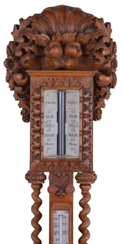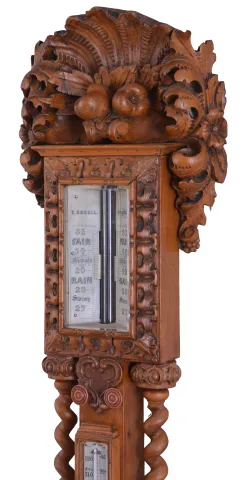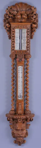 T. Boxell, Brighton, an ornately carved softwood barometer, the base with "green man" mask, trimmed with foliate ornament, beneath a shelf with barley twist columns flanking a thermometer with engraved reamur and fahrenheit scales, the top with engraved barometer scales surrounded by carved trim, and surmounted with a large, removable top carved with scallop shell, fruit and leaves refinished, in good condition overall, some components reglued and with glue residue, a few minor nicks and chips, all scales good, a bit dirty
