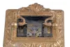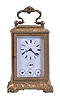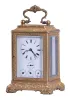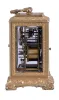 case dirty, minor losses to gilding, specks of verdigris, carrying handle mounts replaced, rear door with replaced knob, front glass with minor chips at corners, glasses with minor chips, dial restored, minute, month, and alarm hands replaced, movement very oily, dirty, with repairs, bell with abrasion at center, ticks and strikes, calendar mechanism incomplete, needs service