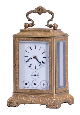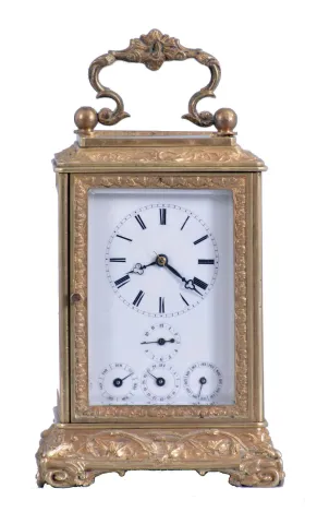 France, a mid 19th century striking carriage clock with alarm and semi perpetual calendar, the gilt, glazed case ornamented with trailing vines and leaves, the side panels of one piece construction with the glasses retained by inner frames, Roman numeral white enamel dial with subsidiary displays for the alarm, month, day, and date, blued steel trefoil hands, 8 day, time and strike movement with lever platform and calendar, with automatic correction for months with less than 31 days, sounding the hour and half hour in passing case dirty, minor losses to gilding, specks of verdigris, carrying handle mounts replaced, rear door with replaced knob, front glass with minor chips at corners, glasses with minor chips, dial restored, minute, month, and alarm hands replaced, movement very oily, dirty, with repairs, bell with abrasion at center, ticks and strikes, calendar mechanism incomplete, needs service