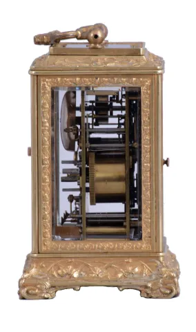 France, a mid 19th century striking carriage clock with alarm and semi perpetual calendar, the gilt, glazed case ornamented with trailing vines and leaves, the side panels of one piece construction with the glasses retained by inner frames, Roman numeral
