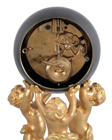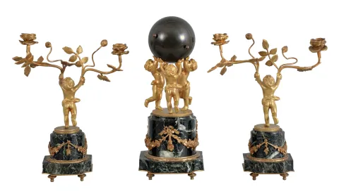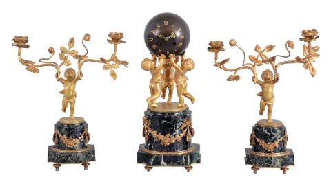France, a three piece marble and gilt bronze mantel garniture, clock and candelabra on matching, variegated, green marble bases, the square plinths with incurved corners supporting attenuated columns draped with floral festoons, the larger, central base with three putti, holding aloft a patinated, spherical clock case with applied Roman numerals, and containing an 8 day, time and strike, pendule de Paris movement, the side pieces each with a single putto, with branching rose stem in each hand, the candle sockets of open rose form, clock dimensions listed losses to gilding, clock base with a vertical crack and losses in marble plinth, marble with a few minor flakes, patination on clock case very good, movement ticks and strikes, bell a poor quality replacement, bell stand screw replaced, bell nut replaced, hammer arm with solder
