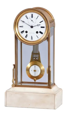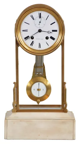 Potonie, Paris, mantel or table regulator, rectangular, white marble, molded base supporting the glazed, arch top case, top with acanthus leaf engraving, sides with trefoil ornamented parapet, and case "floor" with acanthus engraving on a crosshatched field, Roman numeral white enamel dial with seconds chapter below 12:00, blued steel Breguet style hands, 8 day, time and strike movement with square plates, marked "Mouv Surfin", "D. Pontonie & Cie 8113 Paris", and "Horloger P. Bly" below the back cock, gilt, gridiron pendulum with white enamel insert base dirty, and with minor flakes and bruises, gilding good, with minor losses, dial with chip at left winding arbor, hairlines at edge, 10:00, cracks and minor enamel loss at 2:00, these flaws are concealed by the bezel when closed, hands with minor oxidation and loss of color, movement with minor staining, ticks and strikes, enamel on pendulum with a few minor scratches
