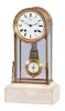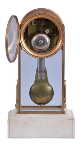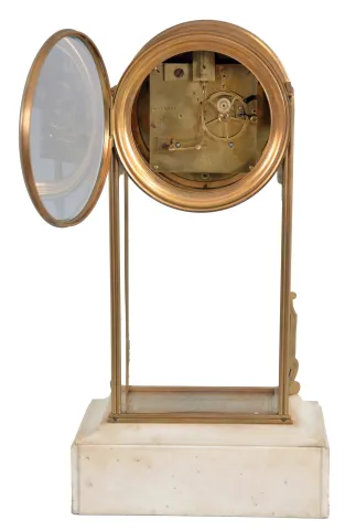 Potonie, Paris, mantel or table regulator, rectangular, white marble, molded base supporting the glazed, arch top case, top with acanthus leaf engraving, sides with trefoil ornamented parapet, and case "floor" with acanthus engraving on a crosshatched
