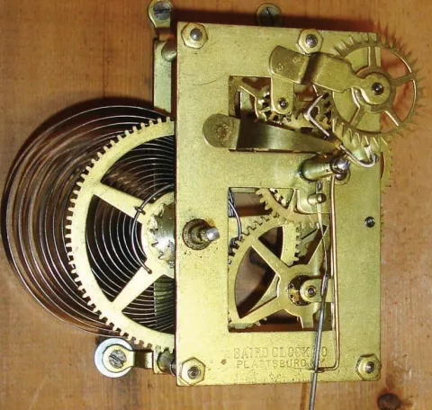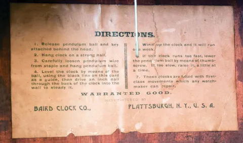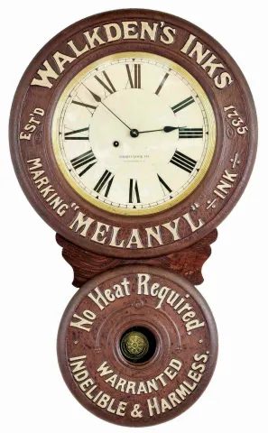 Baird Clock Manufacturing Co., Plattsburg, NY, 8 day, spring driven brass movement advertising wall timepiece. This timepiece advertises the English firm "Walkden's Inks" which was established at London, England in 1735. Walkden was the oldest existing
