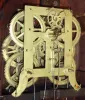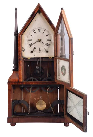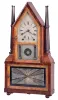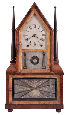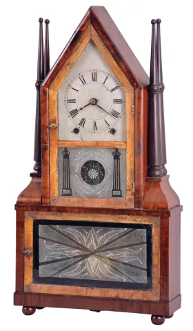 Birge & Fuller, Bristol, Conn., steeple on frame with candle finials or double steeple shelf clock, 8 day, time and strike brass wagon spring movement Refinished mahogany and mahogany veneered case has some loss on the base, small chip on the left side finial base, a nick on the left top molding and a repair at the front peak. Original painted dial has some loss at the mounting pins, at the winding arbors, at the center and a small area on the left side. It looks like someone a long time ago has gold painted the two doors. Both tablets are original. Paper label is missing. Original hands and candle finials.