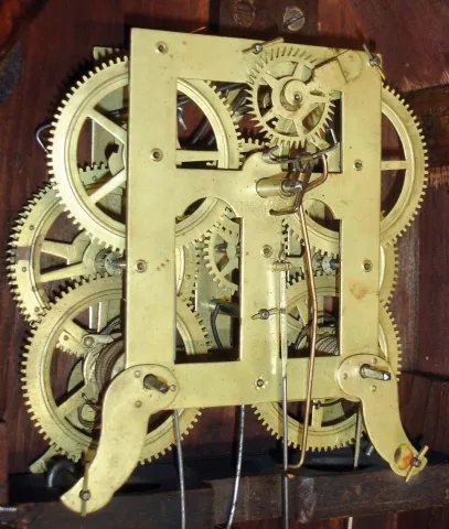 Refinished mahogany and mahogany veneered case has some loss on the base, small chip on the left side finial base, a nick on the left top molding and a repair at the front peak. Original painted dial has some loss at the mounting pins, at the winding arbors, at the center and a small area on the left side. It looks like someone a long time ago has gold painted the two doors. Both tablets are original. Paper label is missing. Original hands and candle finials.
