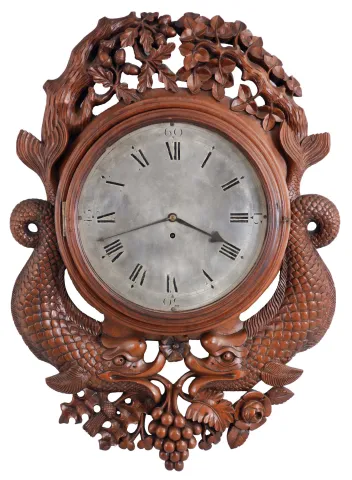 England, an ornately carved gallery timepiece, the mahogany case with turned bezel, surrounded with carved, foliate ornament, and with a pair of full bodied, facing dolphins below, Roman numeral silvered dial, 8 day, fusee timepiece movement The mahogany case is in very fine condition. The engraved silvered brass dial has some wear to the to the black wax filled numbers. Original hands. The fusee movement has its original crown wheel escapement.