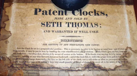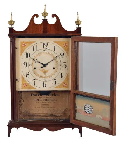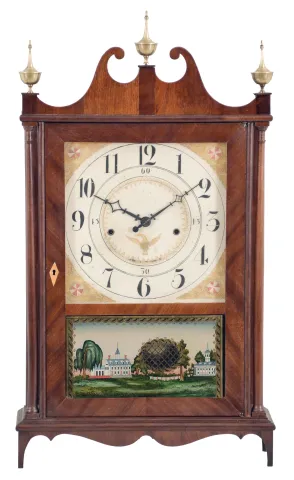 The mahogany case has been refinished. The strap plate movement is correct. The case has a nice interior label. The painted dial has had some of the numerals strengthened, but is handsome with an eagle in the center. The hands proper Thomas style finials may be newer. The tablet is new (by Tom Moberg) and the top door glass is replaced. Overall, a nice example of a scarce model.