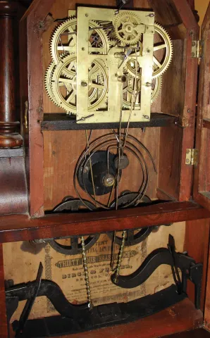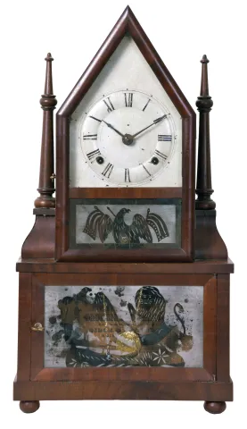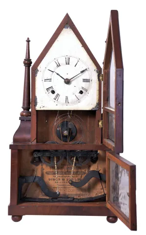 Birge & Fuller, Bristol, Conn. 30 hour, time and strike spring wagon spring miniature steeple on frame with single candle finials.