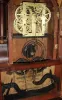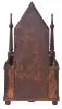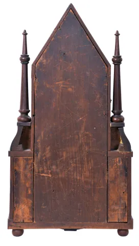 Birge & Fuller, Bristol, Conn. 30 hour, time and strike spring wagon spring miniature steeple on frame with single candle finials. Mahogany and mahogany veneered case in an old finish. There are some chips to the veneer on the base. Original silver stenciled tablets are by Wm. B. Fenn with some loss to the lower one and loss to the border on the top one. Original painted dial has some wear to the numbers and scattered loss on the edges and at the winding arbors. Stamped Chauncey Boardman movement. Original hands. 30 hour wagon springs are much rarer than 8-day ones.