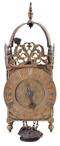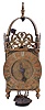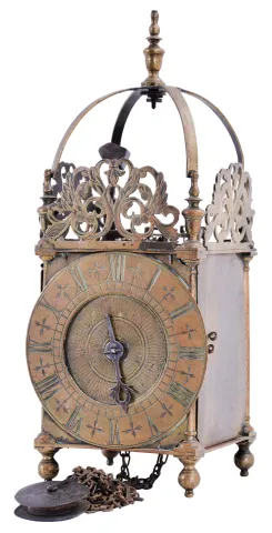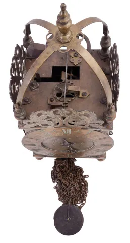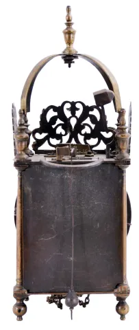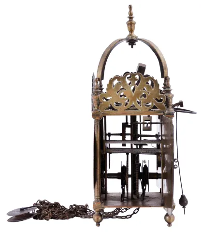 England, unsigned lantern clock, the brass case with turned columns, finials, and feet, top with pierced frets, the front fret with engraving, Roman numeral brass dial, pierced steel hand, 30 hour, weight driven time and strike bob pendulum movement with