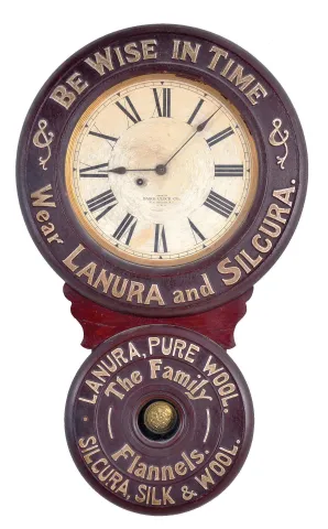 Baird Clock Manufacturing Co., Plattsburgh, New York, "Lanura and Silkura, Silk & Wool", advertising wall clock, 8 day, time and strike, spring driven movement in a painted mixed wood case with paper mache doors displaying embossed advertising including the "The Family Flannels." on the inner ring of lower door and "BE WISE IN TIME & WEAR LANURA AND SILKURA. &" on the upper door with papered metal dials the clock is in outstanding original condition. The case is in excellent condition. The papered dial has normal wear and the label is in excellent condition. The pendulum bob is original. The movement is stamped "BAIRD CLOCK CO".