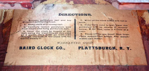 the clock is in outstanding original condition. The case is in excellent condition. The papered dial has normal wear and the label is in excellent condition. The pendulum bob is original. The movement is stamped "BAIRD CLOCK CO".