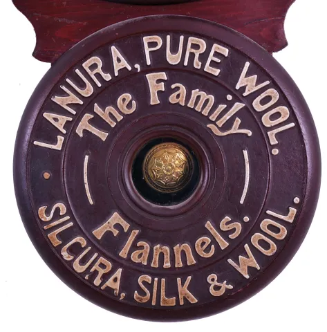 Baird Clock Manufacturing Co., Plattsburgh, New York, "Lanura and Silkura, Silk & Wool", advertising wall clock, 8 day, time and strike, spring driven movement in a painted mixed wood case with paper mache doors displaying embossed advertising including