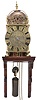 case polished, side frets missing, front left finial repaired, bell cage with old repair, side and back panels replaced, dial good, hand is far too short and either replaced or missing a decorative end. Movement with crown wheel escapement and short pendulum, ticks and strikes, weight tarnished, shelf good.