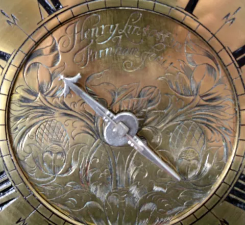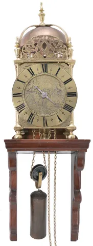 English lantern clock signed "Henry Lintott in Farnham, fecit." Brass case with turned columns, feet and finials, case front with pierced dolphin fret, top with brass bell cage and turned finial, engraved Roman numeral brass dial with engraved center and single, decorated steel hand, 30 hour brass movement with verge escapement and count wheel striking, and brass clad lead weight, together with a 20th century, purpose made bracket for hanging. Henry Lintott, age about 24, bachelor, of Farnham, Surrey, was granted a license to marry Mrs. Mary Mabberly, of Farnham, aged about 22, with consent of her mother, May 18, 1691. The will of Henry Lintott, Watchmaker, of Farnham, Surrey, was probated Apr. 14, 1705 in the Prerogative Court of Canterbury. case polished, side frets missing, front left finial repaired, bell cage with old repair, side and back panels replaced, dial good, hand is far too short and either replaced or missing a decorative end. Movement with crown wheel escapement and short pendulum, ticks and strikes, weight tarnished, shelf good.