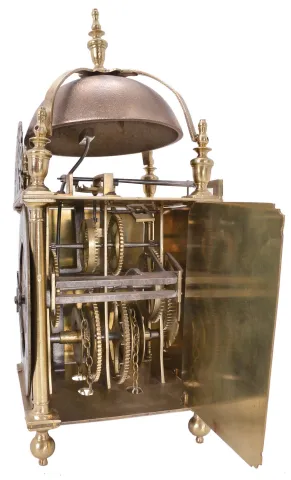 English lantern clock signed "Henry Lintott in Farnham, fecit." Brass case with turned columns, feet and finials, case front with pierced dolphin fret, top with brass bell cage and turned finial, engraved Roman numeral brass dial with engraved center and