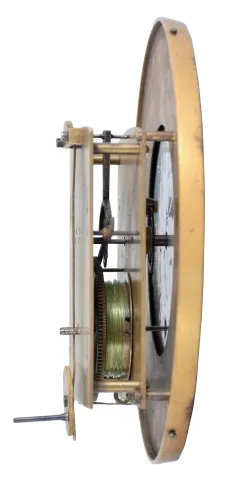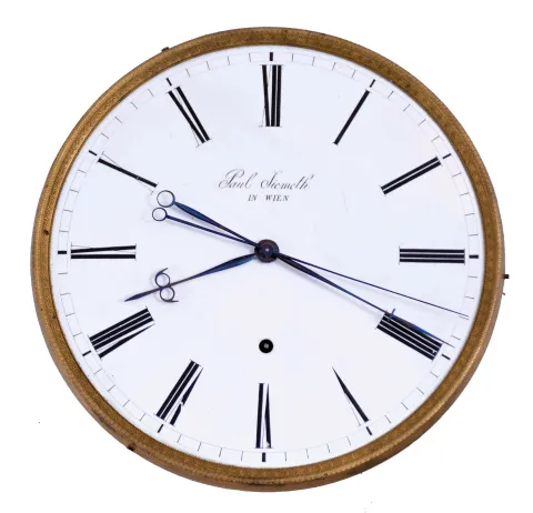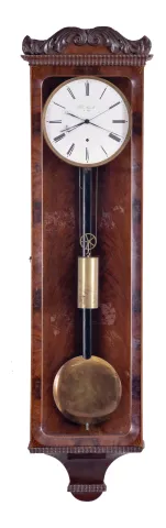 Paul Siemeth, in Wien, 30 day hanging regulator timepiece with sweep seconds in the Biedermeier style, rectilinear, 5 light, mahogany veneered case with boxwood stringing, beveled door, incurved bottom bracket with ripple moldings, and ripple molded cornice, case top with applied foliate carvings, signed Roman numeral white enamel dial, blued steel hands, cylindrical brass weight, and pendulum with ebonized rod and brass bob case good, minor bumps and abrasions, two small veneer losses, minor losses to finish inside case, lower right side glass loose, small loss to carving, top center, dial with minor scratches and a few flakes at the winding arbor, hands with minor oxide, movement dirty, steel parts with some pitting, movement mounting post at lower right interferes with motion of second wheel, escape wheel with poor repairs, crutch replaced, weight replaced, pendulum bob replaced