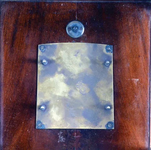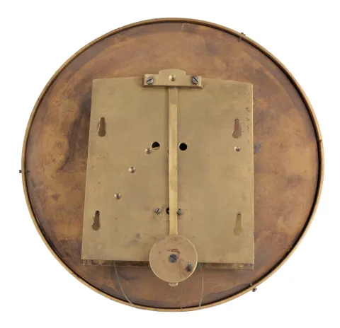 case good, minor bumps and abrasions, two small veneer losses, minor losses to finish inside case, lower right side glass loose, small loss to carving, top center, dial with minor scratches and a few flakes at the winding arbor, hands with minor oxide, movement dirty, steel parts with some pitting, movement mounting post at lower right interferes with motion of second wheel, escape wheel with poor repairs, crutch replaced, weight replaced, pendulum bob replaced