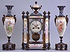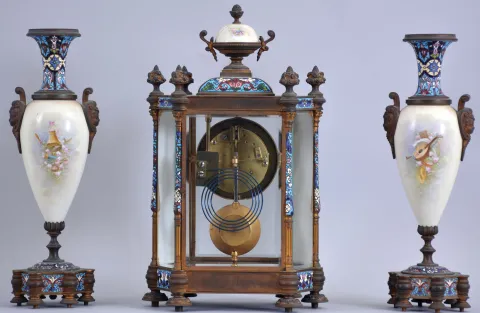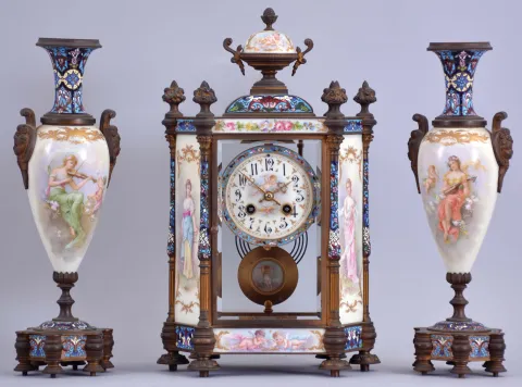 France, a decorative, three piece mantel garniture, the hexagonal, gilt bronze and champleve enamel clock case with columned corners, set with beveled glasses, and porcelain panels with polychrome enamel decoration, the panels with full length portraits of young women, floral ornament, and amorini, Arabic numeral white enamel dial with enamel painting of cupid, the pendulum also with his image, 8 day time and strike pendule de Paris movement, the tall, vasiform sidepieces with portraits and musical trophies, also with champleve enamel, matching the clock case very dirty, gilding worn away, glasses and panels in good condition, porcelain top on urn finial with crack, champleve good, dial and hands good, movement ticks and strikes, side pieces with dirt and worn gilding, porcelain and enamel good