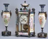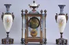 France, a decorative, three piece mantel garniture, the hexagonal, gilt bronze and champleve enamel clock case with columned corners, set with beveled glasses, and porcelain panels with polychrome enamel decoration, the panels with full length portraits