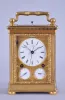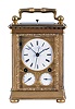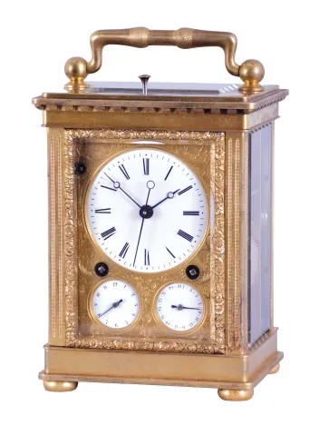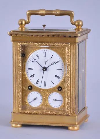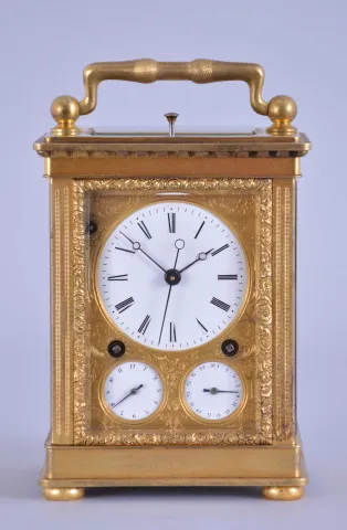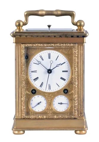 Attributed to Courvoisier, La Chaux de Fonds, Switzerland, quarter striking carriage clock with dead-center seconds, glazed, gilt brass case on turned feet, front door with scalloped ornament, gilt, engraved mask enframing the Roman numeral white enamel dial and subsidiary alarm and date displays, blued steel Breguet style hands, 8 day movement having a chronometer platform with pivoted detent escapement and five arm steel balance, and polished steel strike work with blued springs mounted to the back plate, grand sonnerie (night) striking changing automatically to petit sonnerie (day) striking every twelve hours, repeating the hours and quarters on demand, case bottom with sonnerie/ silent lever, case bottom numbered 118 case dirty, and with losses to gilding, feet replaced, repeat button replaced, dial mask with minor wear at winding apertures, time dial with a few minor scratches, minor chips around holes in date and alarm dials, seconds hand replaced, movement dirty, gummy, a few specks of oxide on bright work, running and striking, service and adjustment recommended, petite striking with one dead blow sounding (an adjustment of the lever which blocks the hammers needed). This clock is essentially identical to clocks by Frederic Courvoisier illustrated in "Carriage and Other Travelling Clocks" by Derek Roberts, and "Carriage Clocks" by Allix & Bonnert. An important difference present in this clock is the use of a central seconds hand, beating dead seconds; this may be unique, as all of the other Courvoisier clocks we are aware of with seconds display do so on a seconds bit below 12:00. Although this clock is unsigned, the favorable comparison with the illustrated clocks supports our attribution. A rare clock.