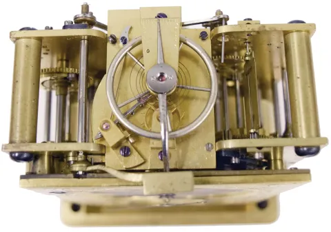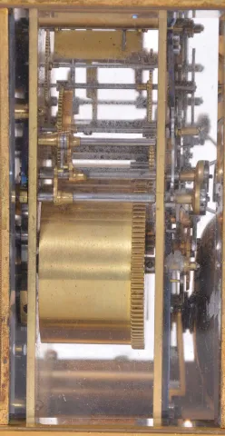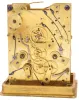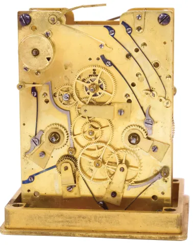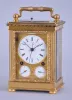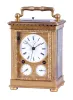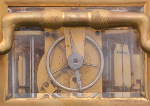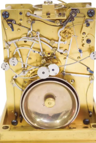 case dirty, and with losses to gilding, feet replaced, repeat button replaced, dial mask with minor wear at winding apertures, time dial with a few minor scratches, minor chips around holes in date and alarm dials, seconds hand replaced, movement dirty, gummy, a few specks of oxide on bright work, running and striking, service and adjustment recommended, petite striking with one dead blow sounding (an adjustment of the lever which blocks the hammers needed). This clock is essentially identical to clocks by Frederic Courvoisier illustrated in "Carriage and Other Travelling Clocks" by Derek Roberts, and "Carriage Clocks" by Allix & Bonnert. An important difference present in this clock is the use of a central seconds hand, beating dead seconds; this may be unique, as all of the other Courvoisier clocks we are aware of with seconds display do so on a seconds bit below 12:00. Although this clock is unsigned, the favorable comparison with the illustrated clocks supports our attribution. A rare clock.