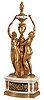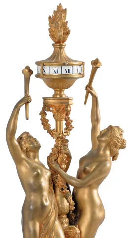 France, a large and impressive figural table clock with annular dial, the white marble base with bow front and back, each with a bead molded, blued steel door, mounted with gilt bronze ornaments, composed of a pair of crossed arrows with bowknot, and intermingled leaves and vines, the sides mounted with gilt floral arrangements, and resting on a conforming, cavetto molded plinth, surmounted by two female nudes flanking a central column with triangular base, and supporting an urn with flame finial containing the dial, each figure bearing a torch to "illuminate" the annular display, high quality 8 day timepiece movement with lever platform contained in the base, and linked to the dial through a rod in the column, front plate marked "AC" within an oval, and numbered 174 dirty, losses to gilding and with some tarnish, scattered specks of verdigris, steel doors reblued with lacquer, marble with a few tiny flakes, a few enamel cartouches with minor hairlines. Movement dirty, running, would benefit from service / cleaning.