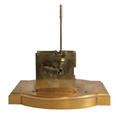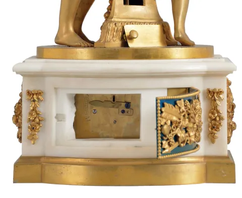 France, a large and impressive figural table clock with annular dial, the white marble base with bow front and back, each with a bead molded, blued steel door, mounted with gilt bronze ornaments, composed of a pair of crossed arrows with bowknot, and
