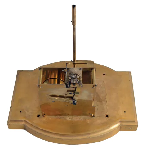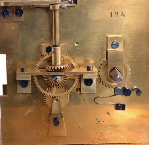dirty, losses to gilding and with some tarnish, scattered specks of verdigris, steel doors reblued with lacquer, marble with a few tiny flakes, a few enamel cartouches with minor hairlines. Movement dirty, running, would benefit from service / cleaning.