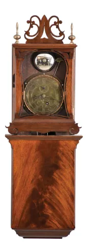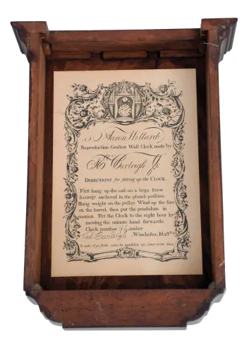 Ted Burleigh Jr., Winchester, Mass., reproduction of an Aaron Willard "Grafton Wall Clock", mahogany case, Roman numeral brass dial, blued steel hands, and 8 day, weight driven timepiece movement. This is number 46 of 50. This timepiece originally