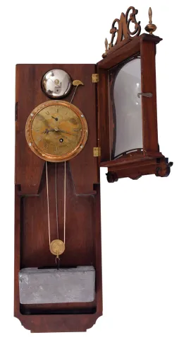 Ted Burleigh Jr., Winchester, Mass., reproduction of an Aaron Willard "Grafton Wall Clock", mahogany case, Roman numeral brass dial, blued steel hands, and 8 day, weight driven timepiece movement. This is number 46 of 50. This timepiece originally retailed for $2,700. The original Willard models only ran 30 hours. Overall this example is in very fine condition with original fret, finials and weight.