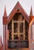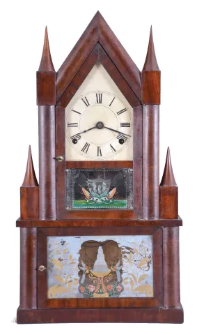 Elisha Manross, Bristol, Conn., mahogany "Steeple on Steeple" or double steeple, with uncommon fusee movement, 8 day, time and strike. overall excellent original condition. Dial has some discoloration and crazing. If you want one double steeple clock, this one has it all. Unusual movement, good original finials, dial, hands, label, finish, etc, and with a pair of superior Fenn tablets, urn at top and birds drinking at a fountain on bottom..