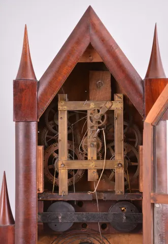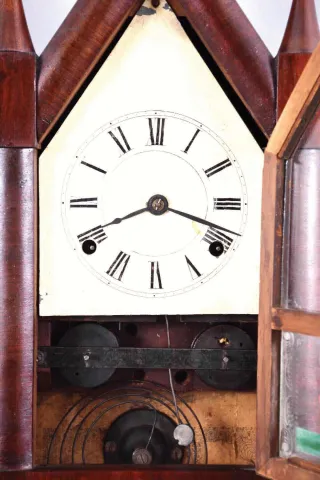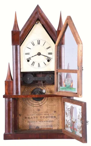 Elisha Manross, Bristol, Conn., mahogany "Steeple on Steeple" or double steeple, with uncommon fusee movement, 8 day, time and strike.