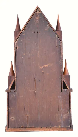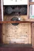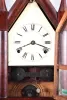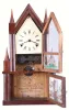 overall excellent original condition. Dial has some discoloration and crazing. If you want one double steeple clock, this one has it all. Unusual movement, good original finials, dial, hands, label, finish, etc, and with a pair of superior Fenn tablets, urn at top and birds drinking at a fountain on bottom..